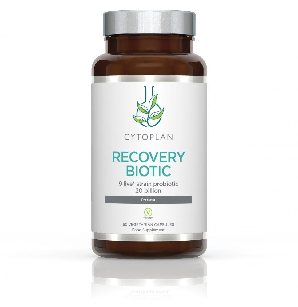 Recovery Biotic is Cytoplan's highest potency live cultures supplement which contains a blend of 9 clinically researched strains. Each capsule contains 20 billion live, friendly bacteria strains alongside prebiotics, suitable for acute use and ongoing use and ideal for use whilst travelling.