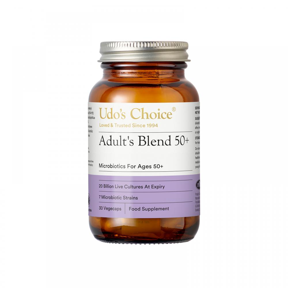 Udo’s Choice Adult’s 50+ Blend Microbiotics contains seven specific bacterial strains at an appropriate strength for seniors – designed for optimum bowel health. Each vegetarian capsule contains 34 billion viable cells at the time of manufacture and at least 20 billion at expiry.