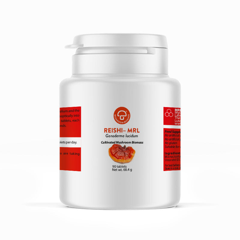 Reishi-MRL tablets (Ganoderma lucidum) contains both mycelium and primordia (young fruit body) cultivated into a biomass that is grown on a sterilised (autoclaved) substrate in EU. The tablets are certified to ISO 22000:2018 standard.